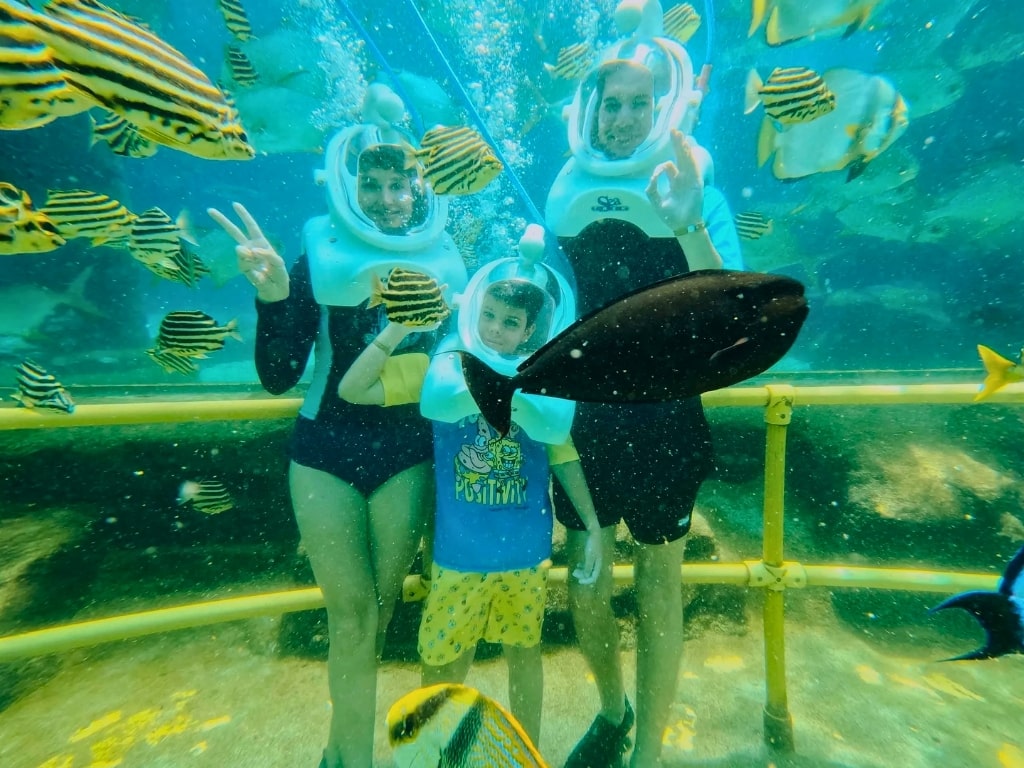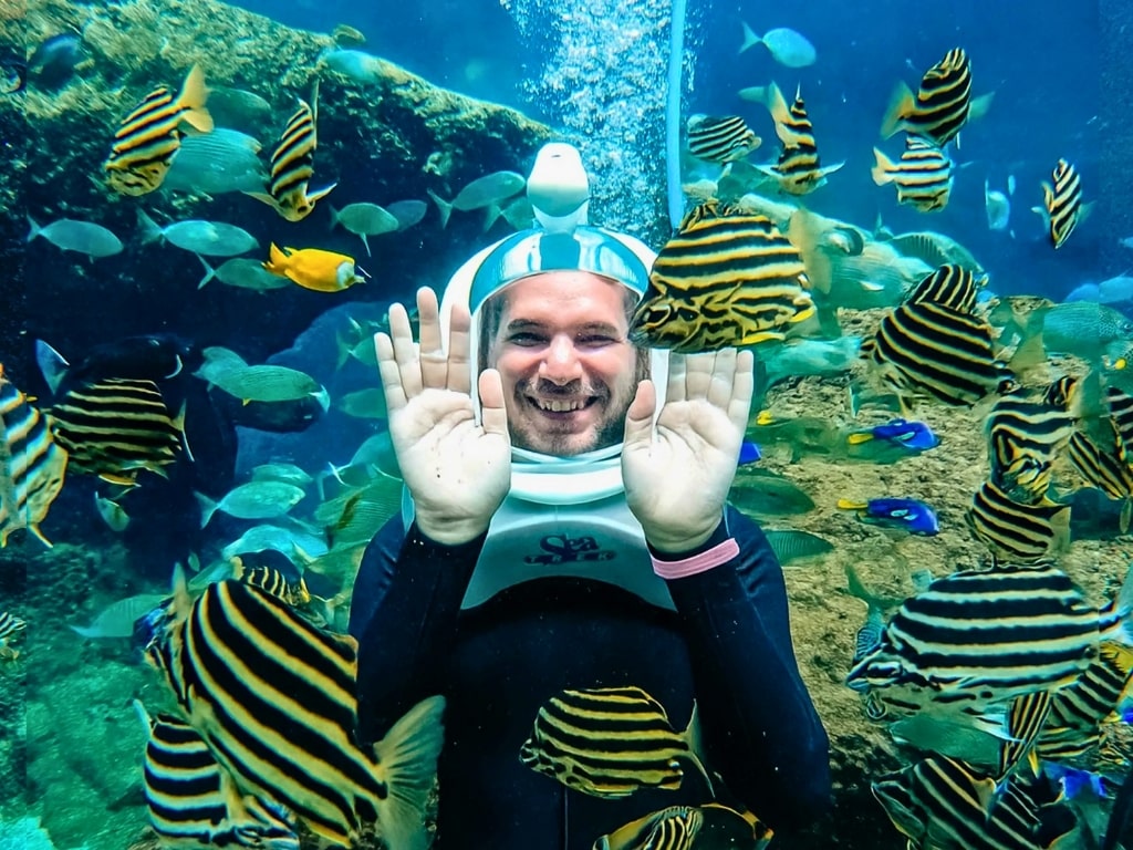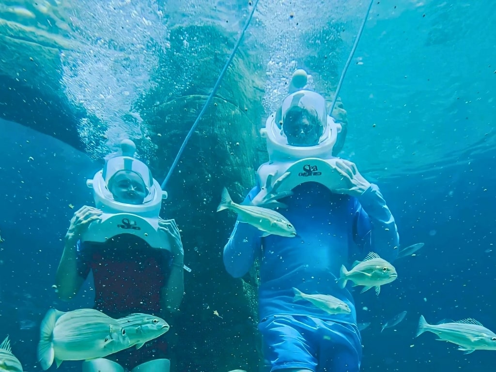 في أرض الأساطير، تأخذكم رحلة أسطورية في مغامرة آسرة تحت الماء. مع خوذات أكسجين خاصة، ستمشون على عمق يتراوح بين 4.5 و5 أمتار في قاع الحوض، محاطين بأحياء بحرية خلابة. هذا البرنامج، الذي يستغرق 15 دقيقة، مناسب للأعمار من 10 سنوات فما فوق، ويوفر لكم تجربة آمنة مع مرشد في مجموعات صغيرة تصل إلى 8 أشخاص. لا يتطلب البرنامج أي مهارات سباحة، مما يجعله الطريقة المثالية لاستكشاف عالم ساحر مخصص عادةً للغواصين.